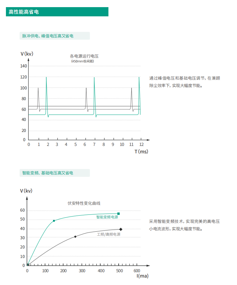 (1)运行能耗低,在相同除尘效率下,能耗仅为高频、高频脉冲、工频电源、三相电源50%以内。